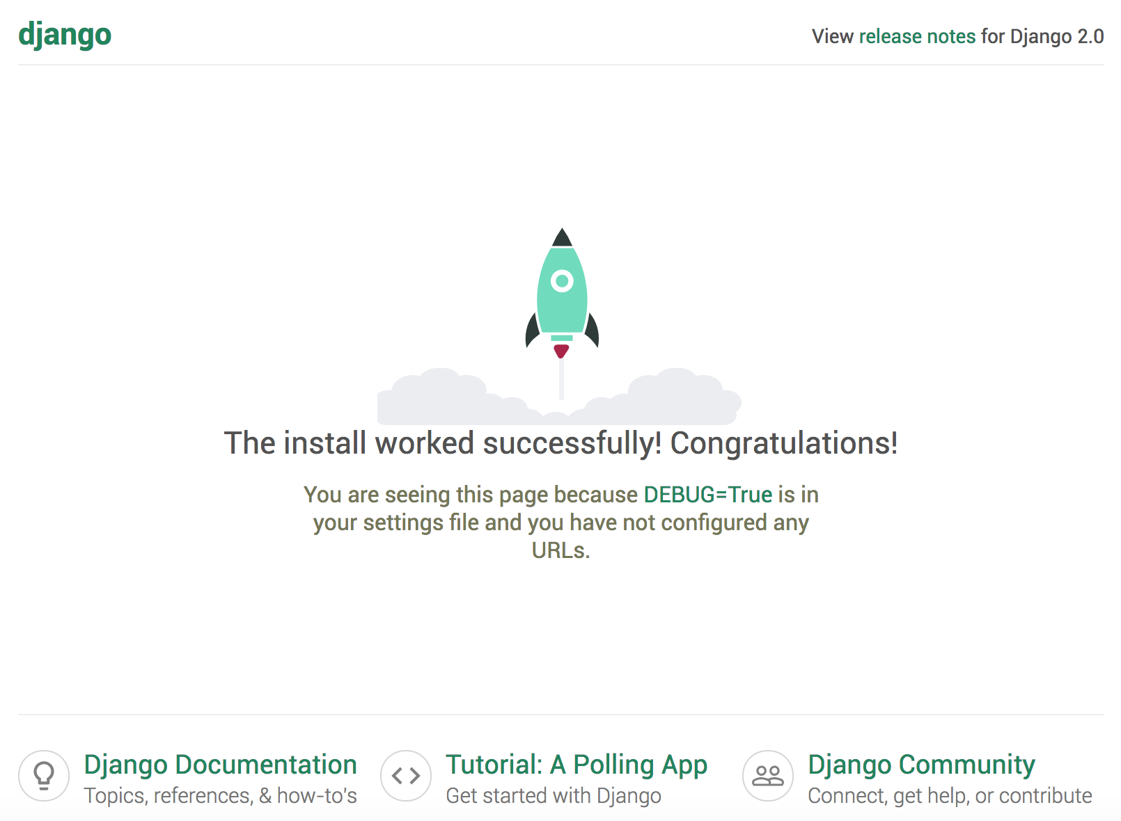 Django版本 Python版本 1.8 2.7、3.2、3.3、3.4、3.5 1.9、1.10 2.7、3.4、3.5 1.11 2.7、3.4、3.5、3.6、3.7(Django 1.11.17) 2.0 3.4、3.5、3.6、3.7 2.1 3.5、3.6、3.7 2.2 3.5、3.6、3.7、3.8(Django 2.2.8) 3.0 3.6、3.7、3.8 启动Django自带的服务器运行项目。