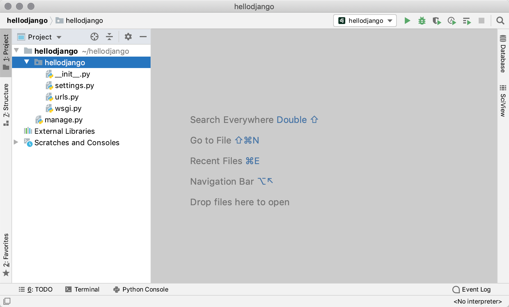 django-admin命令创建Django项目(项目名称为hellodjango)。django-admin --version django-admin startproject hellodjango用PyCharm打开创建好的Djang项目,并为其添加虚拟环境。