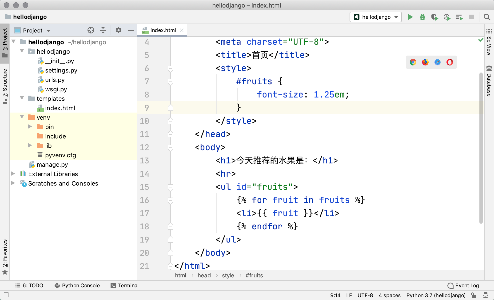 {{ fruit }}这样的模板占位符语法,也使用了{% for %}这样的模板指令,这些都是Django模板语言(DTL)的一部分。关于模板语法和指令,大家可以看看官方文档,相信这些内容还是很容易理解的,并不需要过多的赘述,大家也可以参考官方文档了解模板指令和语法。修改