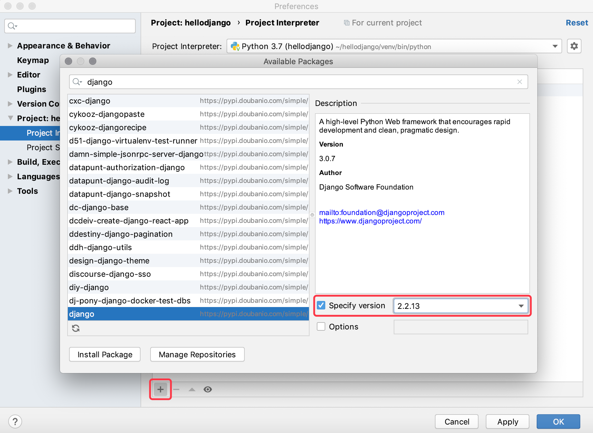 python命令对应的是Python 3的解释器,而pip命令对应的是Python 3的包管理工具。pip install django==2.2.13方法二:在PyCharm的偏好设置中,可以找到项目的解释器环境和已经安装的三方库,可以通过点击添加按钮来安装新的依赖项,需要提醒大家的是在安装Django依赖项时,需要指定版本号,否则将默认安装更新本文时最新的3.0.7版本。
