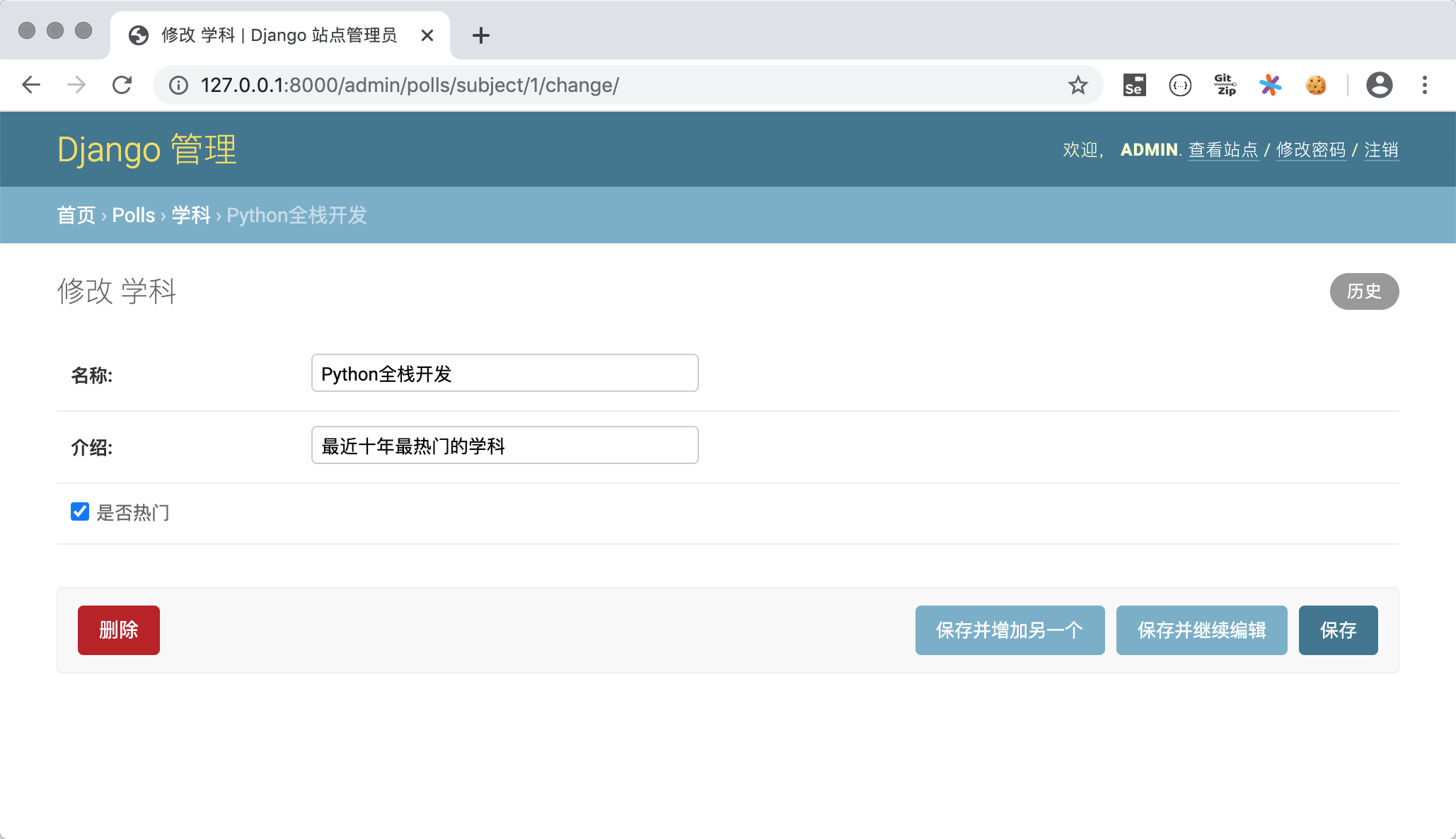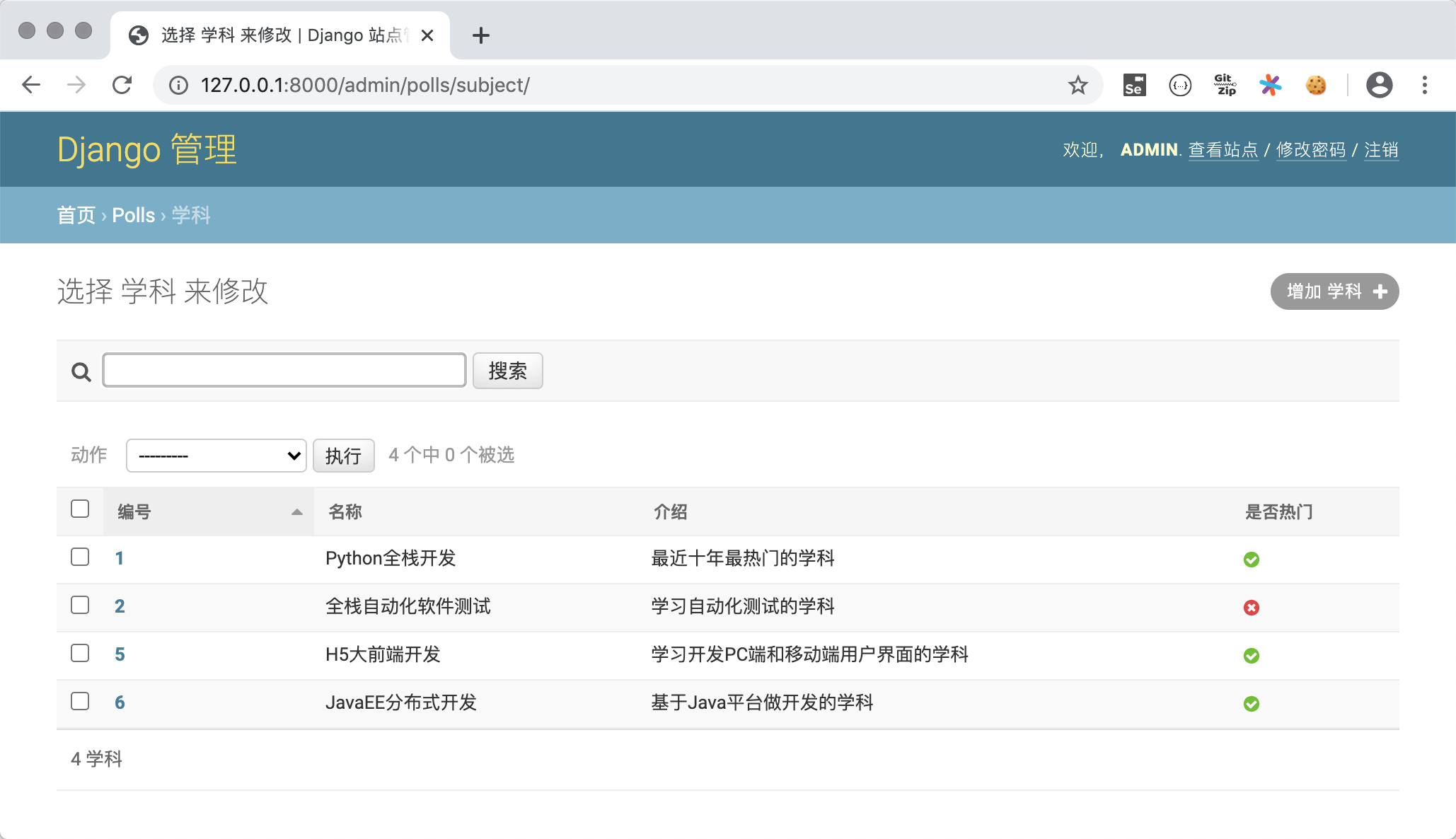 subject2 = Subject(name='全栈软件测试', intro='学习自动化测试的学科', is_hot=False)