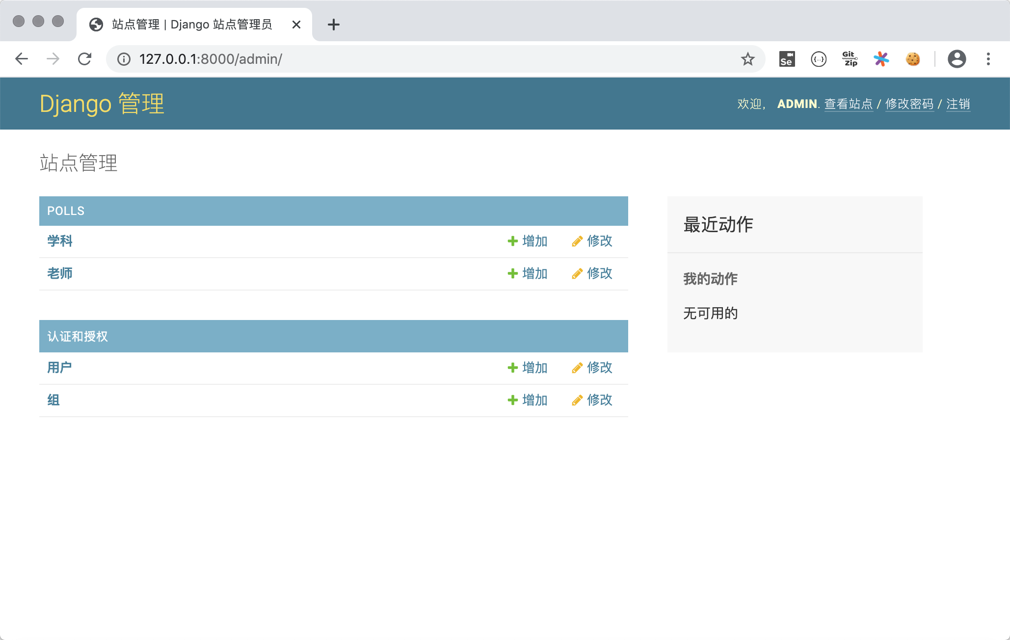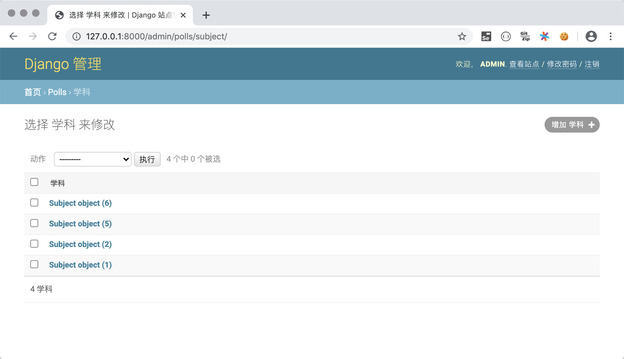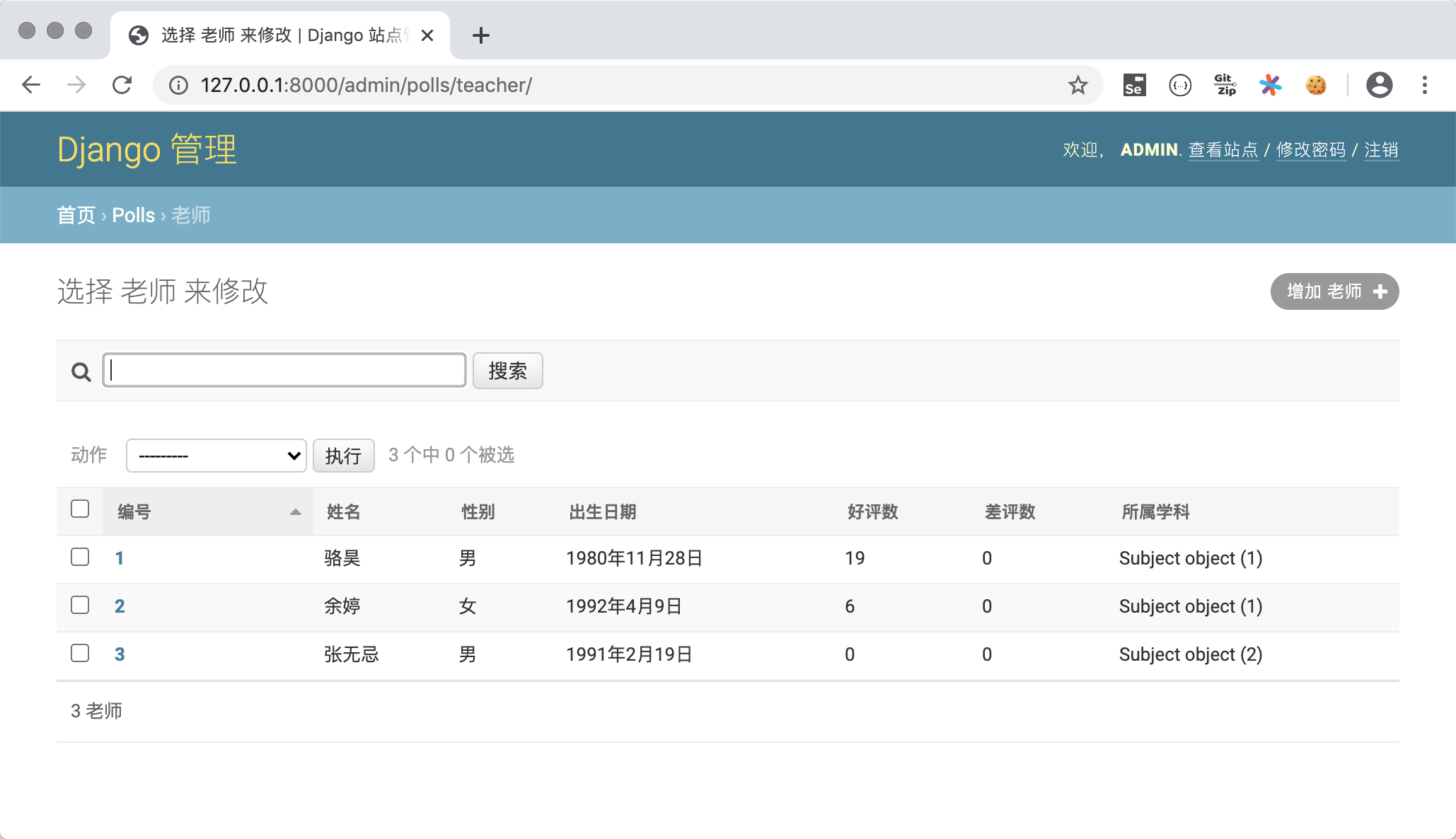 from django.contrib import admin from polls.models import Subject, Teacher admin.site.register(Subject) admin.site.register(Teacher)注册模型类后,就可以在后台管理系统中看到它们。