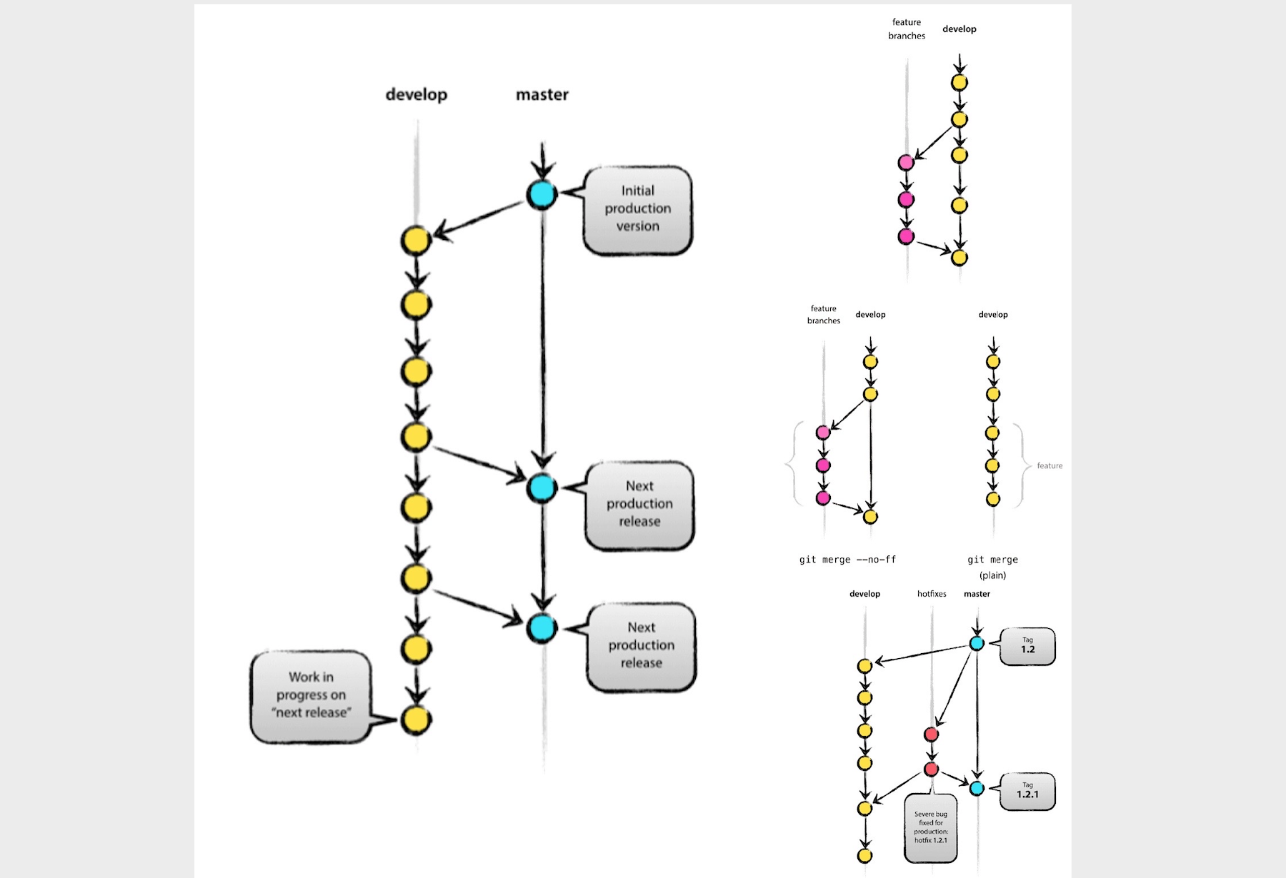 除了上述的github-flow分支管理策略外,还有一种名为git-flow的分支管理策略,它也是大多数公司愿意使用的一套流程。Git-flow借鉴了中央集权型版本控制系统的长处,为团队内部统一建立、合并和关闭分支的方法,如下图所示。