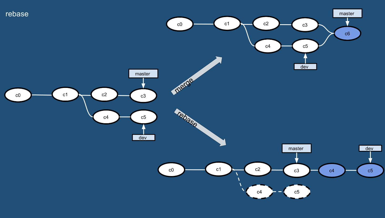 git rebase操作来实现分支变基。如下图所示,当我们希望将master和dev上的工作成果统一到一起的时候,也可以使用变基操作。
