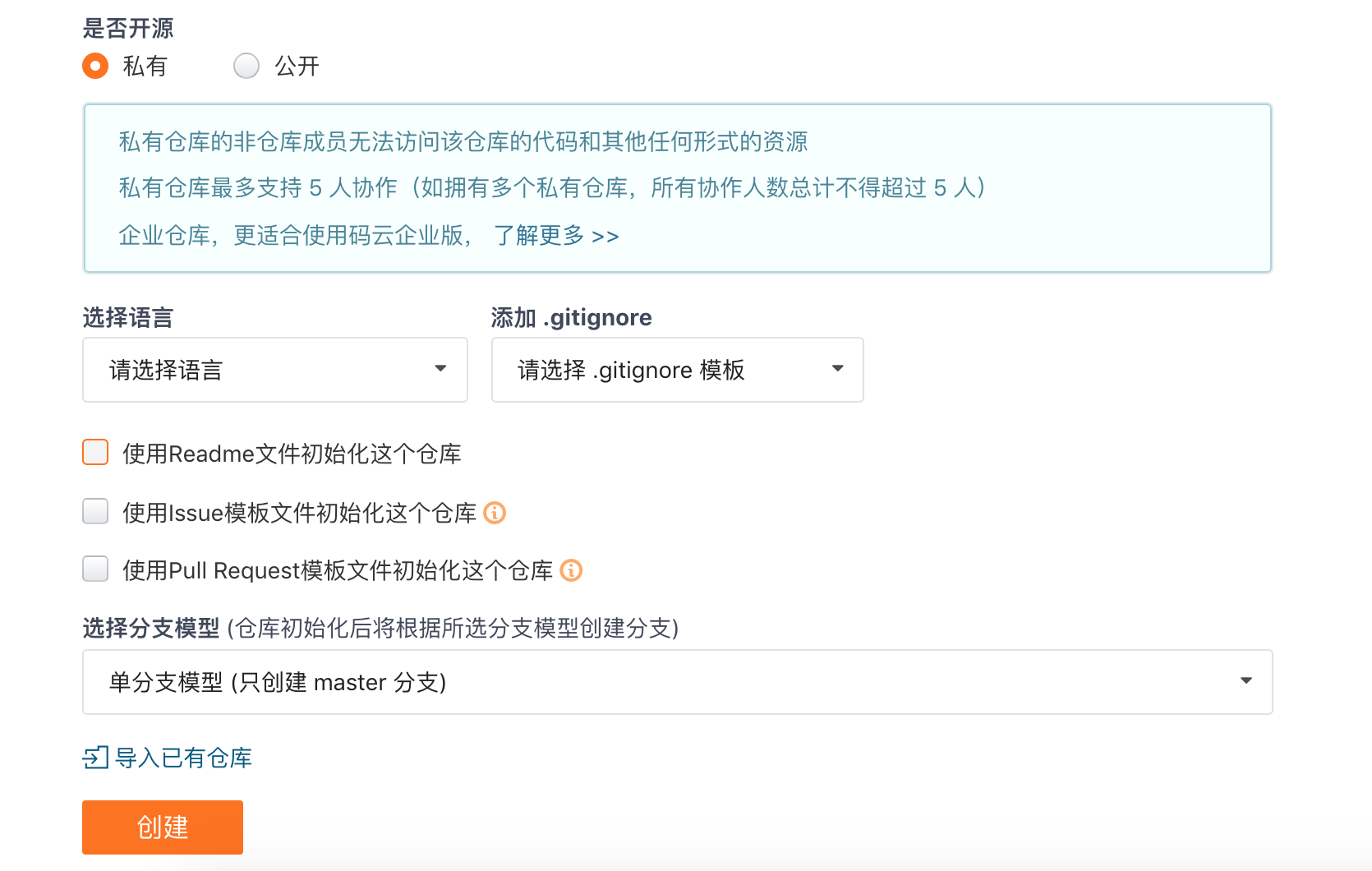 这里我们直接以码云为例来说明使用Git服务器的一些注意事项。首先需要在码云上注册账号,当然也可以使用第三方登录(github账号、微信账号、新浪微博账号、CSDN账号等),登录成功后就可以创建项目,创建项目几乎是“傻瓜式”的,无需赘述,我们只对几个地方加以说明。