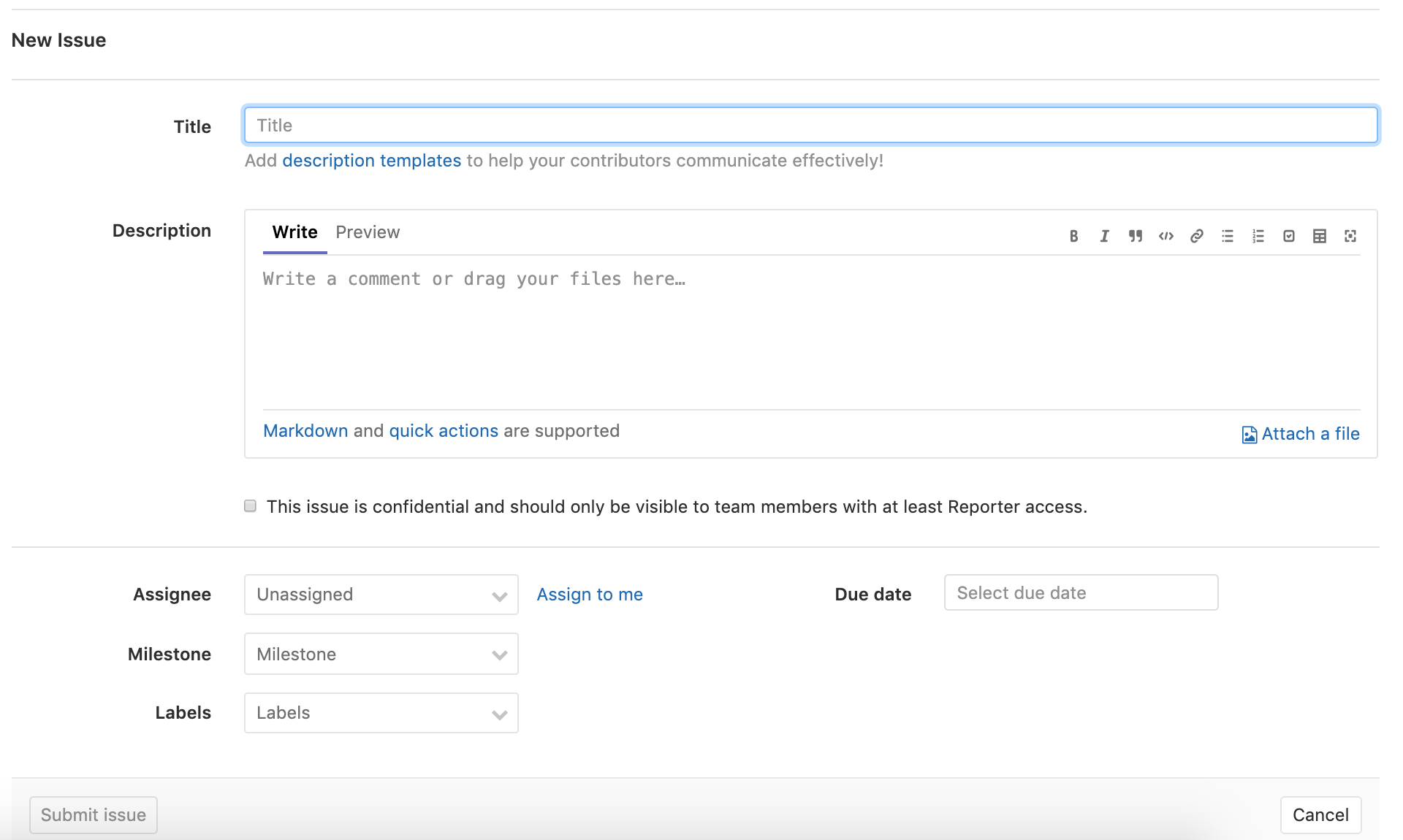 常用的代码托管平台和之前提到的Git私服Gitlab都提供了缺陷管理的功能,当我们要报告一个bug时,可以在如下图所示的界面创建一个新的问题票(issue ticket)。填写的内容包括: