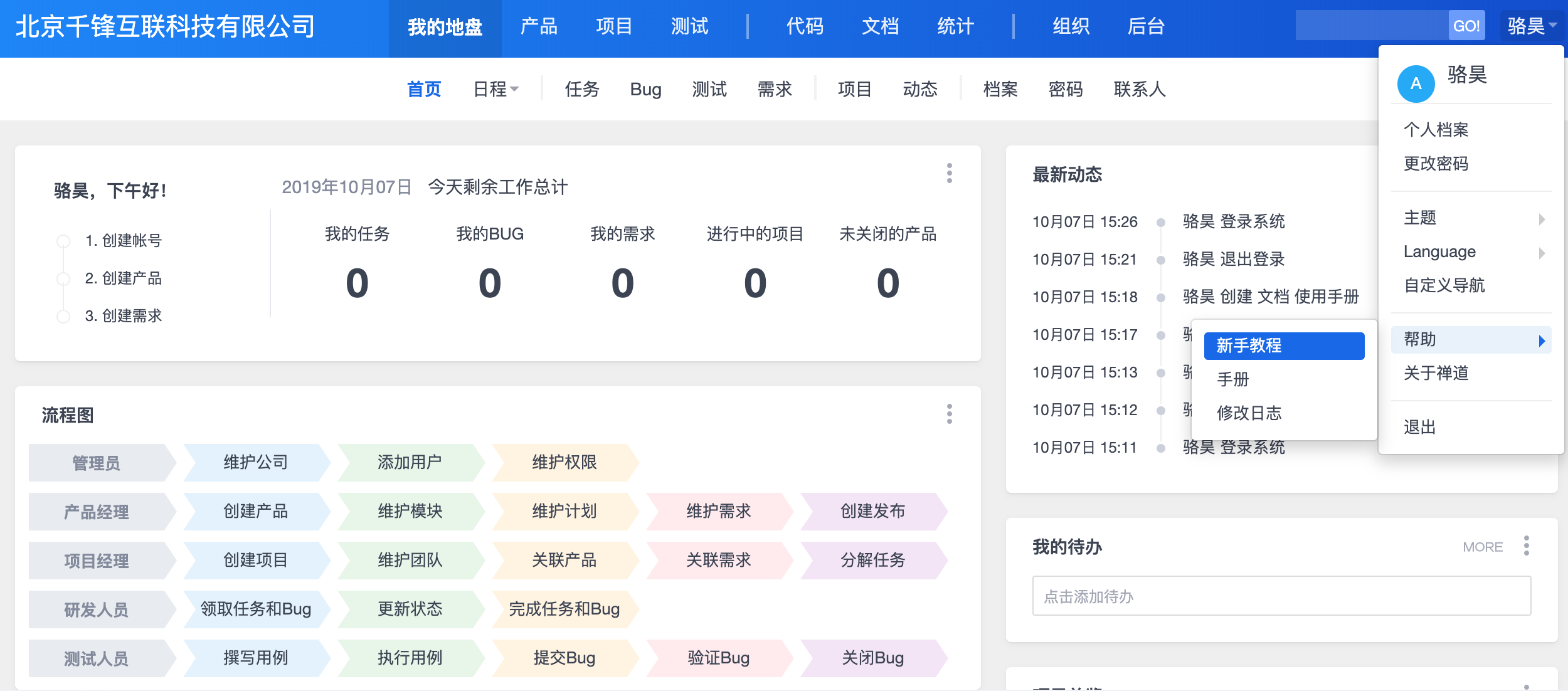 第一次使用禅道时,建议通过点击用户名,然后通过“帮助”菜单的“新手教程”来迅速了解禅道。官方网站的文档链接中提供了视频教程,初学者也可以通过视频教程来上手。